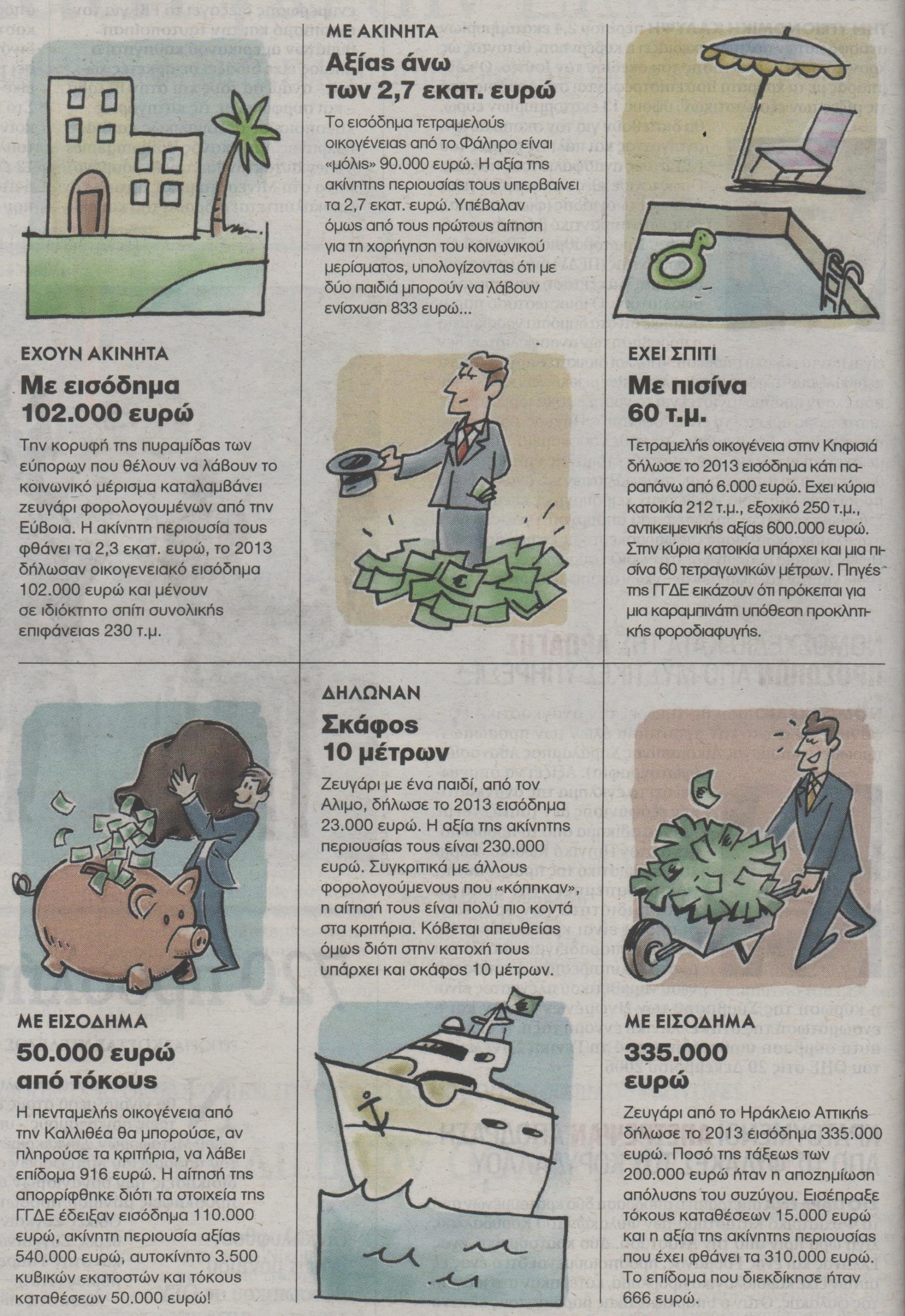 Τα ερωτηματικά διευρύνονται όμως και παραμένουν αναπάντητα επί του παρόντος, όταν διαπιστώνεται ότι δεν είναι ένας αλλά εκατοντάδες. Μέχρι χθες 345.000 αιτήσεις που είχαν υποβληθεί στην ΓΓΠΣ για κοινωνικό μέρισμα, περίπου 150.000 είχαν απορριφθεί. Μεταξύ αυτών 500 φορολογούμενοι οι οποίοι έχουν ακίνητη περιουσία αξίας άνω των 500.000 ευρώ και 900 φορολογουμένων με εισόδημα άνω των 50.000 ευρώ.