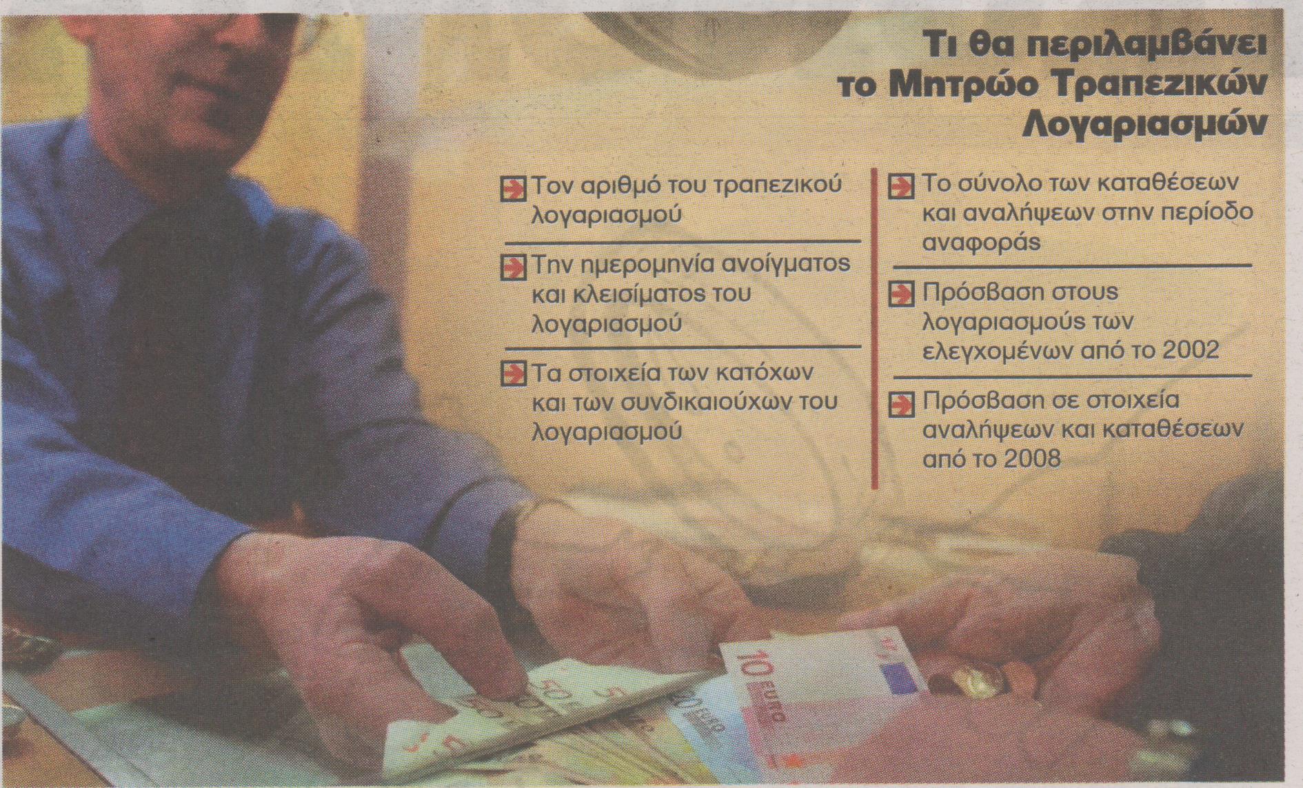 Μέσα στους επόμενους μήνες οι φορολογικές αρχές θα γνωρίζουν με το πάτημα ενός κουμπιού το ύψος των τραπεζικών καταθέσεων ελεύθερων επαγγελματιών, εταιρειών, μισθωτών, αλλά και συνταξιούχων χωρίς να απαιτείται δικαστική εντολή ή άλλες ειδικές διαδικασίες.