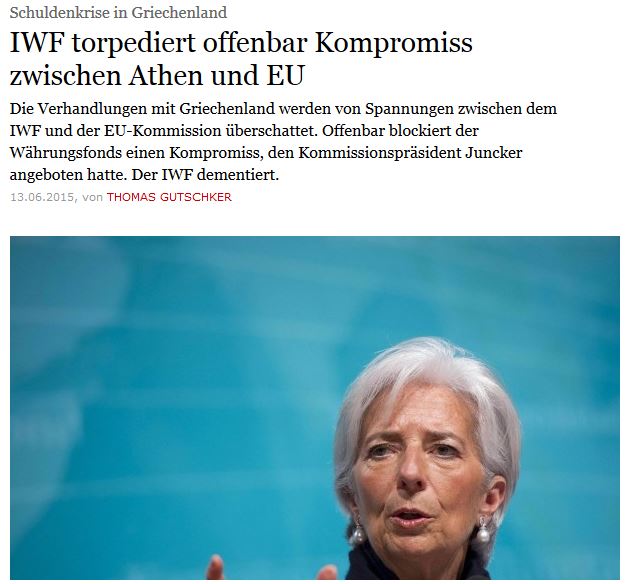 Ποιος τορπιλίζει μια συμφωνίαFrankfurter Allgemeine Zeitung δίνει μια διαφορετική εικόνα από αυτή που καλλιεργείται από τα περισσότερα διεθνή media: Το ΔΝΤ το έκανε.