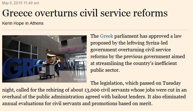Για ανατροπή των «μεταρρυθμίσεων» της προηγούμενης κυβέρνησης στη Δημόσια Διοίκηση κάνει λόγο δημοσίευμα στην εφημερίδα Financial Times, μετά «την έγκριση στο ελληνικό κοινοβούλιο του νόμου που πρότεινε η κυβέρνηση στην οποία ηγείται ο αριστερός ΣΥΡΙΖΑ» ακυρώνοντας περικοπές.