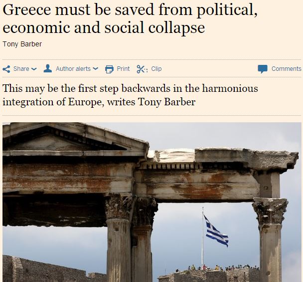 Δεν έχει νόημα να προσπαθήσει κανείς να αποδώσει ευθύνες για αυτό που διαγράφεται ως μια ελληνική χρεοκοπία και την έξοδο από το ευρώ. Το ρολόι δεν θα σταματήσει επειδή οι εταίροι της Ελλάδας στην ευρωζώνη – αν το εταίροι είναι η σωστή λέξη – έχουν δηλώσει ότι η υπομονή τους τελείωσε. Η Ελλάδα βρίσκεται στην Νοτιοανατολική Ευρώπη και η σταθερότητα της Νοτιοανατολικής Ευρώπης είναι ζήτημα ύψιστης σημασίας για την Ε.Ε. και το ΝΑΤΟ.