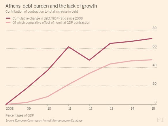 Το άλμα του ποσοστού του χρέους είναι καμπανάκι για τους πιστωτές της Ελλάδας. Οι δικές τους αναθεωρημένες προβλέψεις για τη βιωσιμότητα του βάρους του χρέους της στην Ελλάδα εξαρτάται πολύ περισσότερο από την προώθηση της οικονομικής ανάπτυξης παρά από το πρωτογενές πλεόνασμα. Αυτό σημαίνει πως η απαίτηση περισσότερης δημοσιονομικής εξυγίανσης δεν είναι πλέον μόνο κακό για την Ελλάδα αλλά και για τους ίδιους τους πιστωτές.