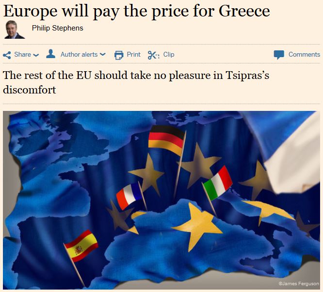 Η Ελλάδα έχει την ευθύνη για την δύσκολη θέση στην οποία βρίσκεται. Ωστόσο, παραμένει ένα ζωτικό κομμάτι στην γεωστρατηγική σταθερότητα της ηπείρου. Και ό,τι και αν λένε οι κεντρικοί τραπεζίτες και οι υπουργοί Οικονομικών, μια ευρωζώνη χωρίς την Ελλάδα θα είναι μια πολύ πιο αδύναμη, πιο κοντά σε μια ένωση σταθερών συναλλαγματικών ισοτιμιών παρά σε μια νομισματική ένωση. Φυσικά, η στήριξη της Ελλάδας θα έχει κόστος. Αλλά όχι τόσο μεγάλο όσο η αποχώρηση της.