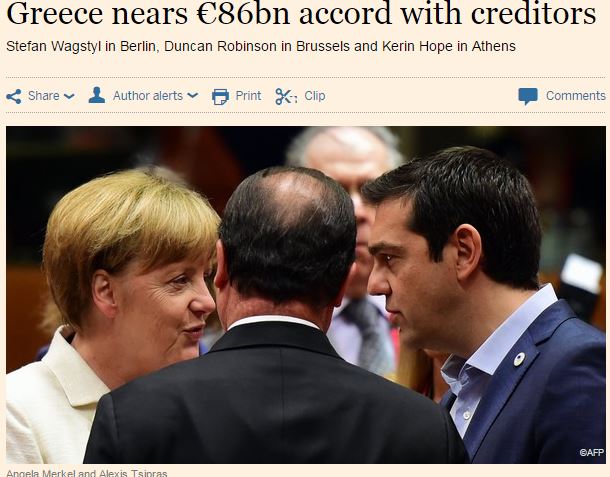 Η Ελλάδα και οι πιστωτές της κοντεύουν να κλείσουν μία συμφωνία αυτή την εβδομάδα σχετικά με το πρόγραμμα διάσωσης 86 δισ. ευρώ της υπερχρεωμένης χώρας καθώς αυξάνονται τα σημάδια απομόνωσης της Γερμανίας, λόγω της σκληρής στάσης της απέναντι στην Αθήνα, αναφέρει ρεπορτάζ στους Financial Times.