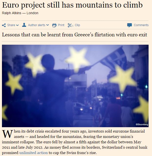 Όταν η κρίση χρέους της ευρωζώνης κλιμακώθηκε πριν από τέσσερα χρόνια, οι επενδυτές πωλούσαν ό,τι περιουσιακά στοιχεία είχαν στη ζώνη του κοινού νομίσματος και … πήραν τα βουνά, φοβούμενοι επικείμενη κατάρρευση της νομισματικής ένωσης. Το ευρώ υποχώρησε κατά σχεδόν ένα τέταρτο έναντι του δολαρίου από το Μάιο του 2011 και 2012. Καθώς τα χρήματα εισέρρεαν στην Ελβετία, η κεντρική τράπεζα της χώρας υποσχέθηκε να κάνει τα πάντα ώστε να τεθεί ένα ανώτατο όριο στην άνοδο του ελβετικού φράγκου.