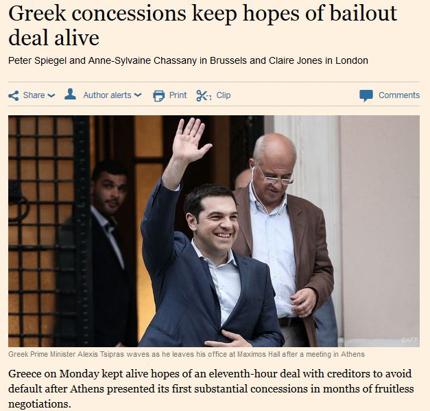 Η στροφή στη στάση της ελληνικής πλευράς κρατά ζωντανές τις ελπίδες για συμφωνία «διάσωσης», είναι ο κεντρικός τίτλος στο πρωτοσέλιδο των Financial Times.