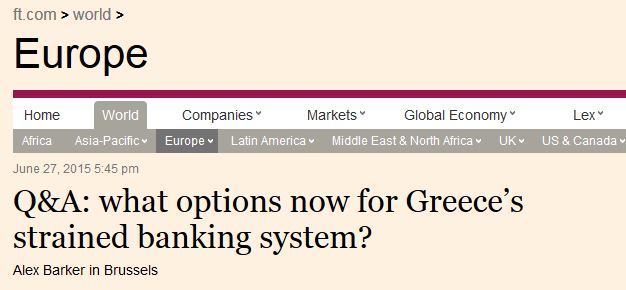 Η φυγή καταθέσεων επιταχύνεται και οι επιλογές χρηματοδότησης της Ελλάδας τελειώνουν. Κάθε ευρώ που αποσύρεται από τις αυτόματες ταμειακές μηχανές καλύπτεται από έκτακτη ρευστότητα από την Ευρωπαϊκή Κεντρική Τράπεζα. Χωρίς την παράταση του προγράμματος διάσωσης της Ελλάδας, τα έκτακτα αυτά δάνεια από την ΕΚΤ τίθενται εν αμφιβόλω.