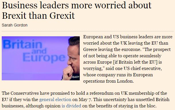 Οι επιχειρηματίες σε Ευρώπη και ΗΠΑ ανησυχούν πολύ περισσότερο για μια αποχώρηση της Βρετανίας από την Ε.Ε., ένα Brexit, παρά για μια έξοδο της Ελλάδας από το ευρώ, ένα Grexit, αναφέρει σχόλιο στη βρετανική εφημερίδα Financial Times.