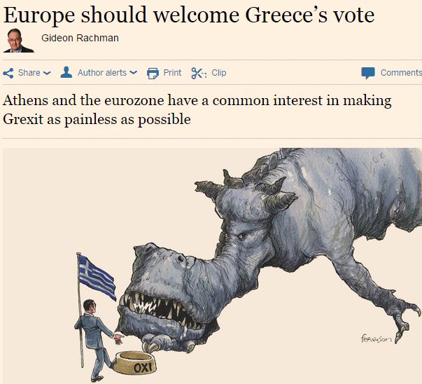 Ο κ. Τσίπρας είπε στους συμπατριώτες του ότι με το όχι μπορεί να πετύχει μια καλύτερη συμφωνία από την Ευρώπη. Αλλά, αν πιστεύει πραγματικά κάτι τέτοιο, τότε έχει παρεξηγήσει σοβαρά την πολιτική πραγματικότητα της ΕΕ. Οι πιστωτές τώρα είναι πιθανό να ακολουθήσουν μια πολύ σκληρή γραμμή. Είναι θυμωμένοι και έχουν απαυδήσει με την Ελλάδα. Και το πιο σημαντικό είναι, ότι πολλοί πιστεύουν ότι η μακροπρόθεσμη επιβίωση του ευρωπαϊκού ενιαίου νομίσματος εξαρτάται από το αν θα γίνει ξεκάθαρο, πως οι χώρες πρέπει να ζουν με κοινούς κανόνες, να ισοσκελίζουν τους προϋπολογισμούς τους και να πληρώνουν τα χρέη τους. Εάν η Ελλάδα χρειάζεται να τιμωρηθεί, προκειμένου αυτό να γίνει σαφές, τότε είναι έτοιμοι να την τιμωρήσουν.