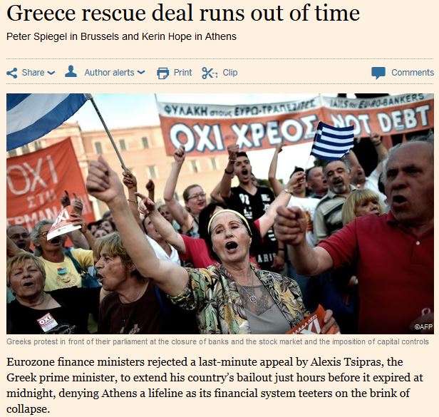 Ο πρόεδρος του Eurogroup Γερούν Ντάισελμπλουμ δήλωσε ότι είναι πολύ αργά για να υπάρξει παράταση του ελληνικού προγράμματος το οποίο εκπνέει σήμερα. Οι θεσμοί θα εξετάσουν το αίτημα της ελληνικής κυβέρνησης για ένα νέο πρόγραμμα στήριξης μόνο αφού διεξαχθεί το δημοψήφισμα, είπε.