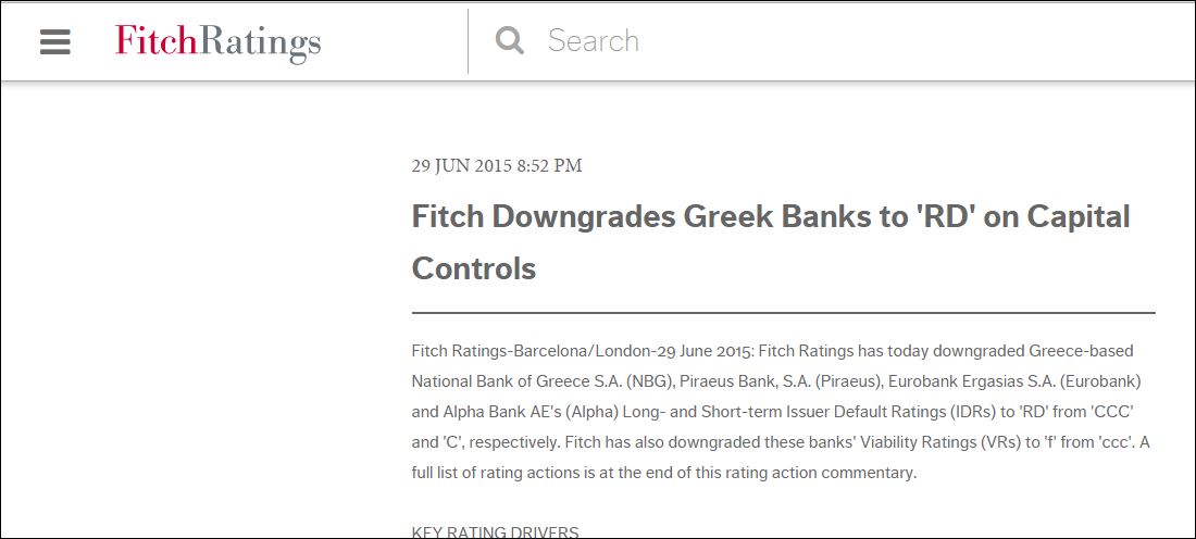 Η υποβάθμιση όπως επισημαίνεται στην ανακοίνωση του οίκου αξιολόγησης ακολουθεί την ανακοίνωση των ελληνικών αρχών για τραπεζική αργία και έλεγχο στην κίνηση κεφαλαίων, κυρίως συμπεριλαμβανομένων των περιορισμών στις αναλήψεις, που ο οίκος Fitch θεωρεί ως «περιορισμένη χρεοκοπία» («RD»), διότι οι περιορισμοί των καταθέσεων επηρεάζουν ένα σημαντικό μέρος των υποχρεώσεων των τραπεζών.