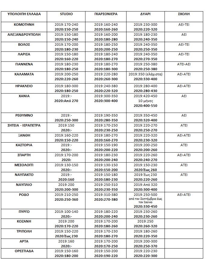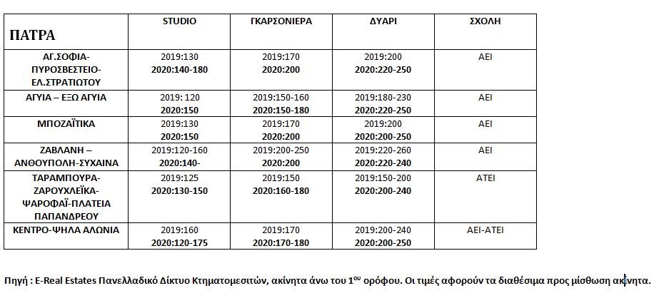 -Στην Πάτρα όπου αποτελεί διαχρονικά φοιτητική πόλη, οι τιμές μίσθωσης για γκαρσονιέρες και δυάρια το 2019 σ σχέση με το 2018, είχαν καταγράψει μείωση της τάξεως του 20%, ενώ τη φετινή χρονιά οι τιμές καταγράφουν αυξητικές τάσεις.