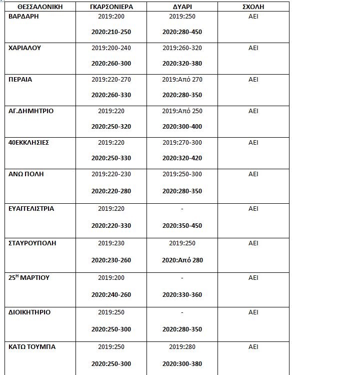 -Στο Κουκάκι το μηνιαίο κόστος μίσθωσης για γκαρσονιέρα κυμαίνεται από 320€ έως 450€ και το δυάρι από 450€ έως 600€, όταν οι αντίστοιχες τιμές το 2019 ήταν από 450€ έως 750€(επιπλωμένο) και από 450€ έως 720€.\