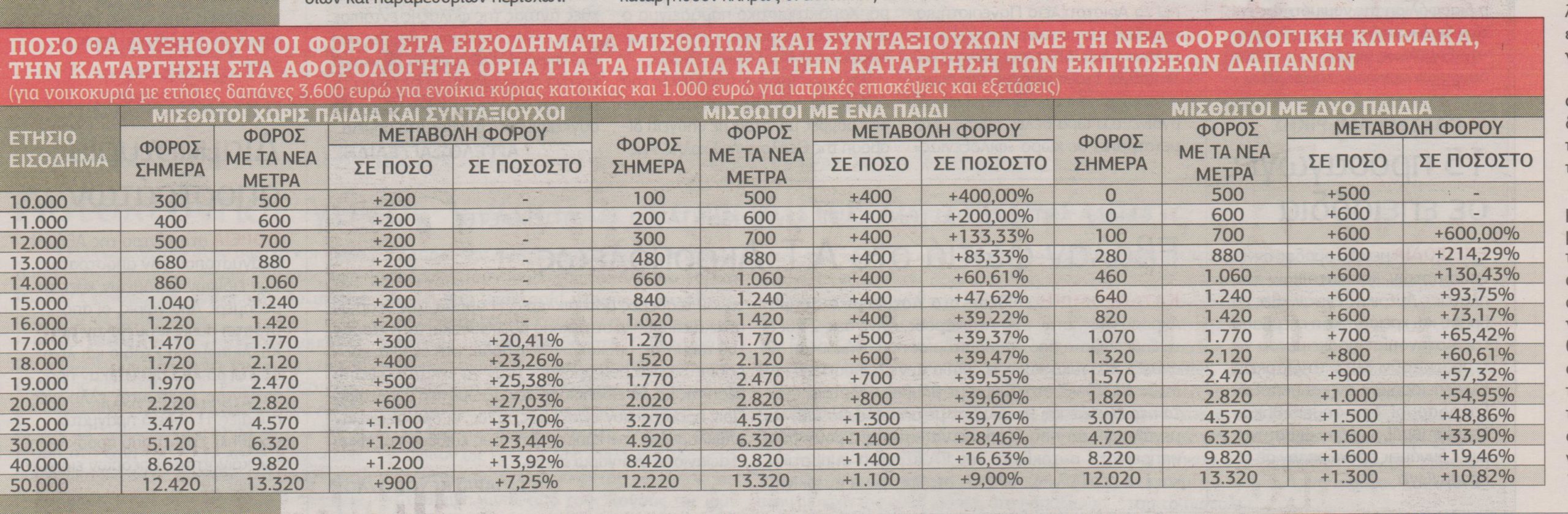 Ακόμη πιο ισχυρό είναι το φοροσόκ που επιφυλάσσουν η ηγεσία του υπουργείου Οικονομικών και η τρόικα σε εκατομμύρια μισθωτούς, συνταξιούχους και αυτοαπασχολούμενους.Οπως αποκαλύπτει σήμερα ο Ελεύθερος Τύπος, οι νέες φοροεισπρακτικές ρυθμίσεις που σχεδιάζει το υπουργείο Οικονομικών για τα εισοδήματα των φυσικών προσώπων δεν θα περιοριστούν μόνο στην κατάργηση των αφορολογήτων ορίων για τα προστατευόμενα τέκνα, ούτε στην αυτοτελή φορολόγηση των καθαρών εισοδημάτων των αυτοαπασχολούμενων με συντελεστη 35%.Το πακέτο θα περιλαμβάνει κι άλλα μέτρα-φωτιά:- Θα καταργηθούν όλες οι εκπτώσεις δαπανών από το φόρο εισοδήματος φυσικών προσώπων.- Θα καταργηθούν οι περισσότερες από τις αλλαγές που ισχύουν στη φορολογία εισοδήματος φυσικών προσώπων, με αποτέλεσμα να επιβληθούν φόροι στην ιδιοκατοίκηση και στα επιδόματα των τριτέκνων, των πολύτεκνων, των ανέργων και των χαμηλοσυνταξιούχων.- Θα εξαλειφθούν όλα τα ειδικά ευνοϊκά φορολογικά καθεστώτα που ισχύουν για χιλιάδες κατοίκους ελληνικών νησιών και παραμεθόριων περιοχών. ΠΑΤΗΣΤΕ ΠΑΝΩ ΣΤΟΝ ΠΙΝΑΚΑ ΓΙΑ ΜΕΓΑΛΥΤΕΡΗ ΑΝΑΛΥΣΗ