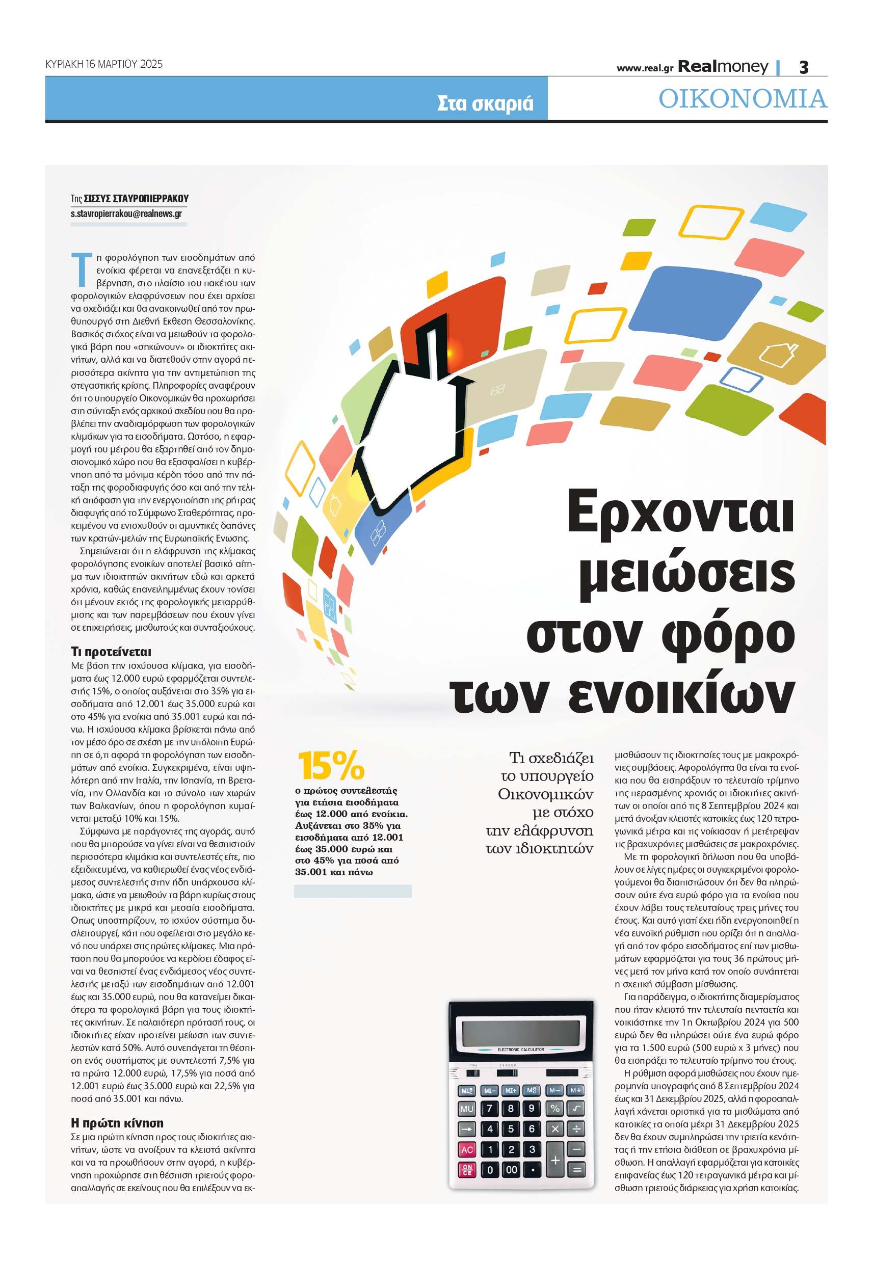Σημειώνεται ότι η ελάφρυνση της κλίμακας φορολόγησης ενοικίων αποτελεί βασικό αίτημα των ιδιοκτητών ακινήτων εδώ και αρκετά χρόνια, καθώς επανειλημμένως έχουν τονίσει ότι μένουν εκτός της φορολογικής μεταρρύθμισης και των παρεμβάσεων που έχουν γίνει σε επιχειρήσεις, μισθωτούς και συνταξιούχους.