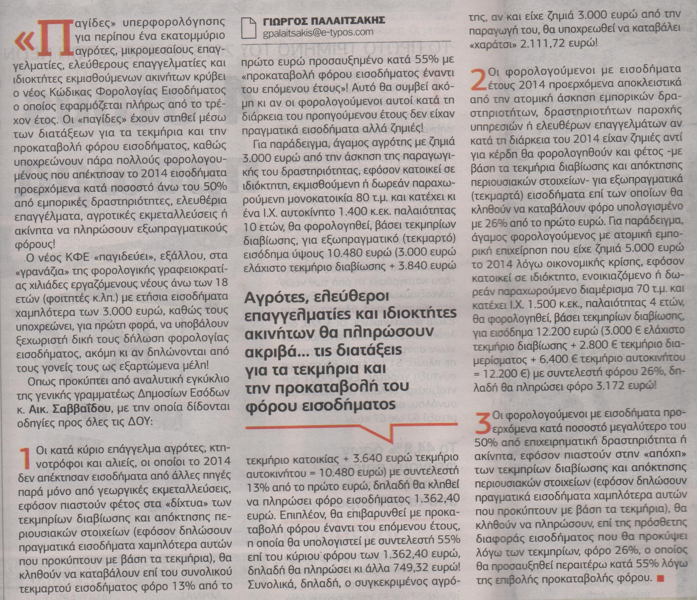 «Παγίδες» υπερφορολόγησης για περίπου ένα εκατομμύριο αγρότες, μικρομεσαίους επαγγελματίες, ελεύθερους επαγγελματίες και ιδιοκτήτες εκμισθούμενων ακινήτων κρύβει ο νέος Κώδικας Φορολογίας Εισοδήματος ο οποίος εφαρμόζεται πλήρως από το τρέχον έτος.