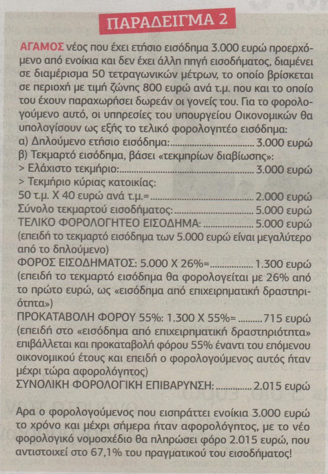 Διατάξεις-βόμβα με τις οποίες θα επιβάλλονται εξωφρενικοί φόροι, από 1.200 έως 4.000 ευρώ το χρόνο, σε εκατοντάδες χιλιάδες πολίτες που δεν έχουν καθόλου εισόδημα από περιστασιακή απασχόληση ή από πολύ χαμηλά ενοίκια, περιλαμβάνει το νέο φορολογικό νομοσχέδιο.