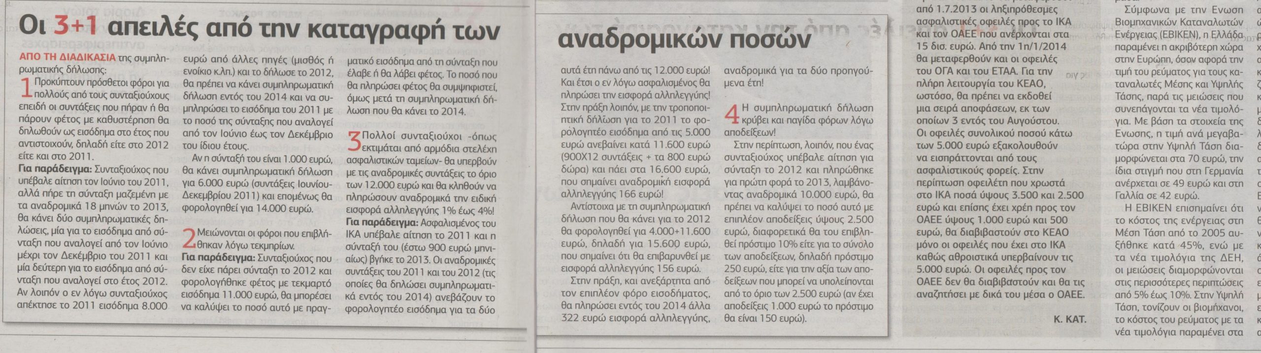 Οι εν λόγω συνταξιούχοι που, λόγω της πολύμηνης καθυστέρησης στην έκδοση των συνταξιοδοτικών αποφάσεων από τα Ταμεία, λαμβάνουν ήδη ή πρόκειται να λάβουν φέτος τις συντάξεις που δικαιούνται από την ημερομηνία υποβολής της αίτησης συνταξιοδότησης, υποχρεώνονται να ζητήσουν εντός του 2014 τις σχετικές βεβαιώσεις αποδοχών από τα Ταμεία τους, να υποβάλουν συμπληρωματικές φορολογικές δηλώσεις εισοδήματος για τα οικονομικά έτη 2012 και 2011, αναγράφοντας τα ποσά των αναδρομικών συντάξεων που αντιστοιχούν στα έτη αυτά και να πληρώσουν αυξημένους φόρους, εισφορά αλληλεγγύης, αλλά και πρόστιμο, λόγω έλλειψης αποδείξεων.