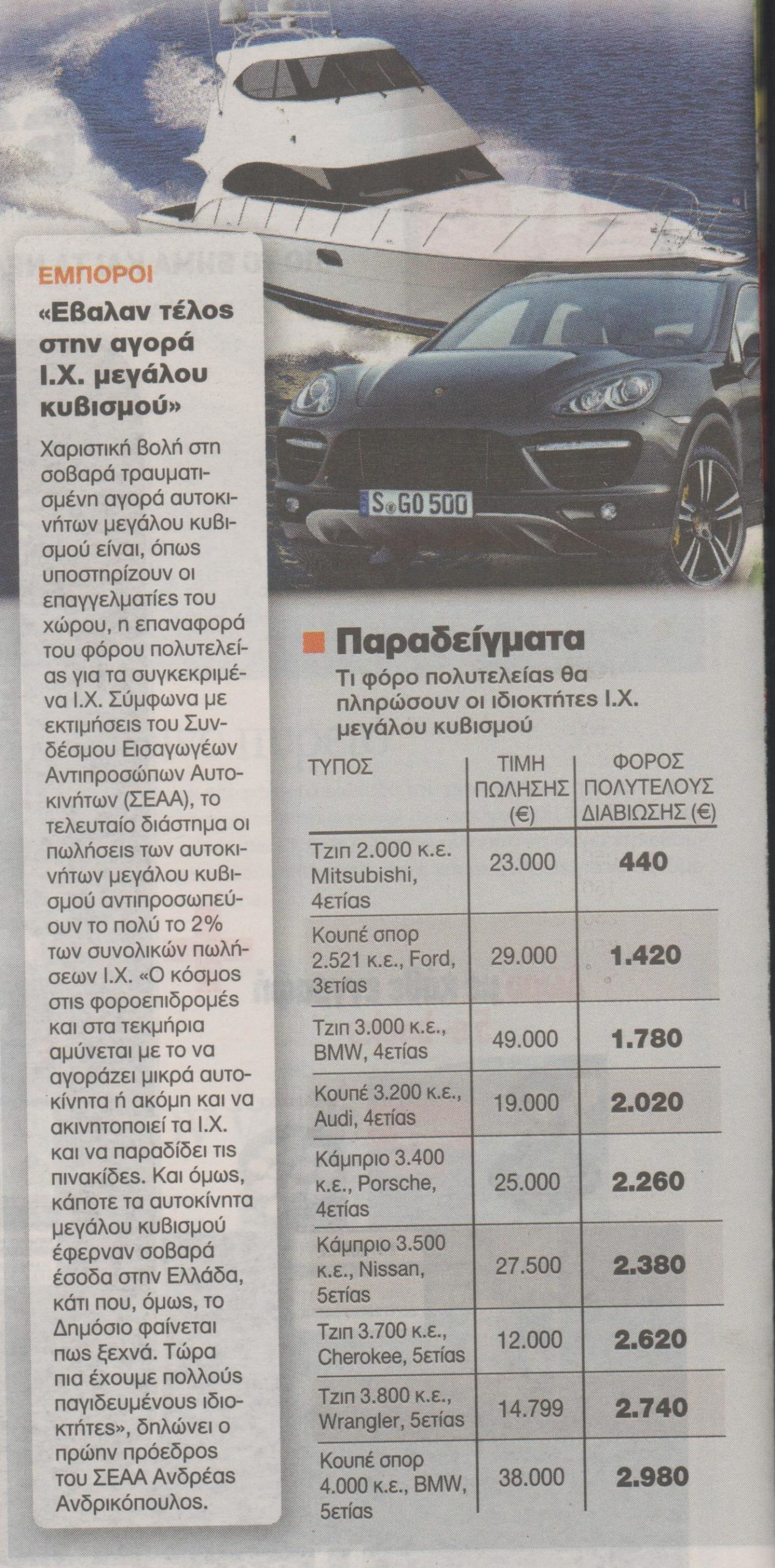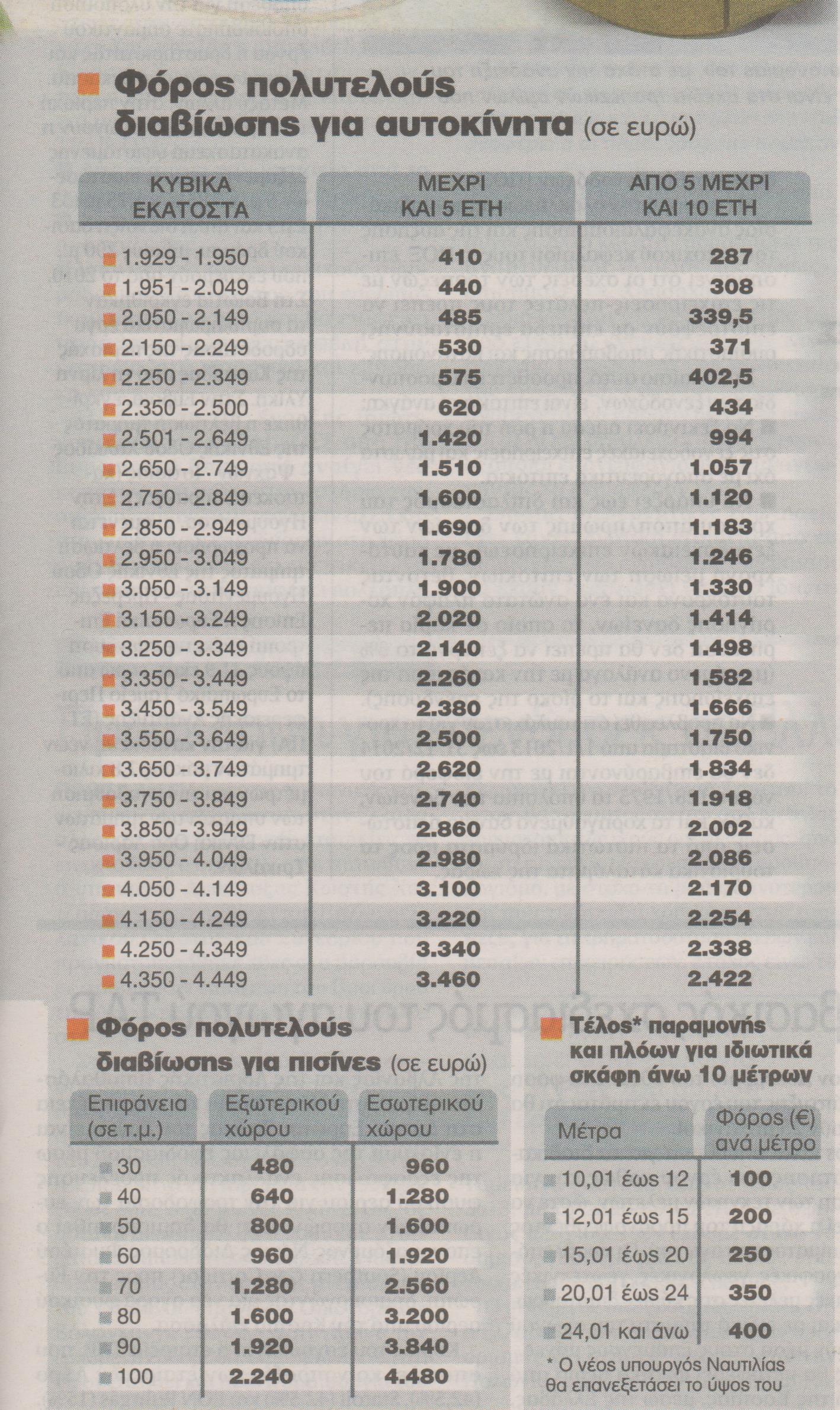 Μόνο από την επιβολή του φόρου πολυτελούς διαβίωσης στα Ι.Χ. αυτοκίνητα το Δημόσιο εκτιμά ότι θα εισπράξει γύρω στα 70 εκατ. ευρώ από περίπου 120.000 ιδιοκτήτες αυτοκινήτων (μέσος φόρος 583 ευρώ). Ο φόρος επιβάλλεται σε οχήματα με κινητήρες από 1.929 κυβικά εκατοστά και άνω και μετά την πενταετία απομειώνεται. Για τα αυτοκίνητα από 1.929 έως 2.500 κυβικά ο φόρος ανέρχεται στο 5% της αντικειμενικής δαπάνης (τεκμήριο διαβίωσης), ενώ για τα αυτοκίνητα από 2.501 κυβικά και άνω ο φόρος υπολογίζεται με συντελεστή 10% επί του τεκμηρίου διαβίωσης.