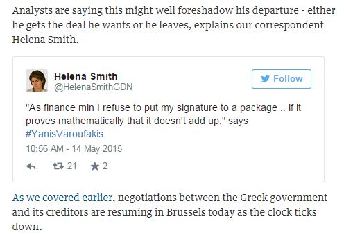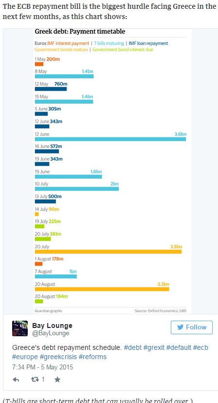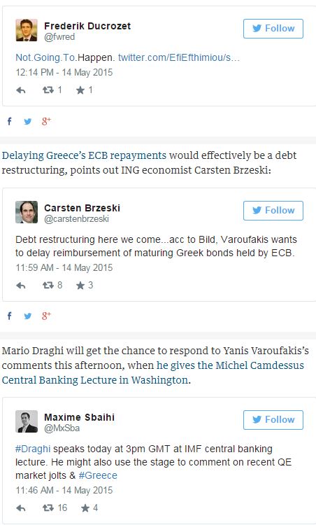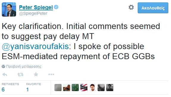 Φωτιά στο twitter έχει βάλει η δήλωση του Γιάνη Βαρουφάκη για μετάθεση πληρωμών κάποιων ομολόγων στο απώτερο μέλλον, «όπως για παράδειγμα αυτά που διακρατεί η Ευρωπαϊκή Κεντρική Τράπεζα και τα οποία λήγουν το καλοκαίρι» όπως ανέφερε.