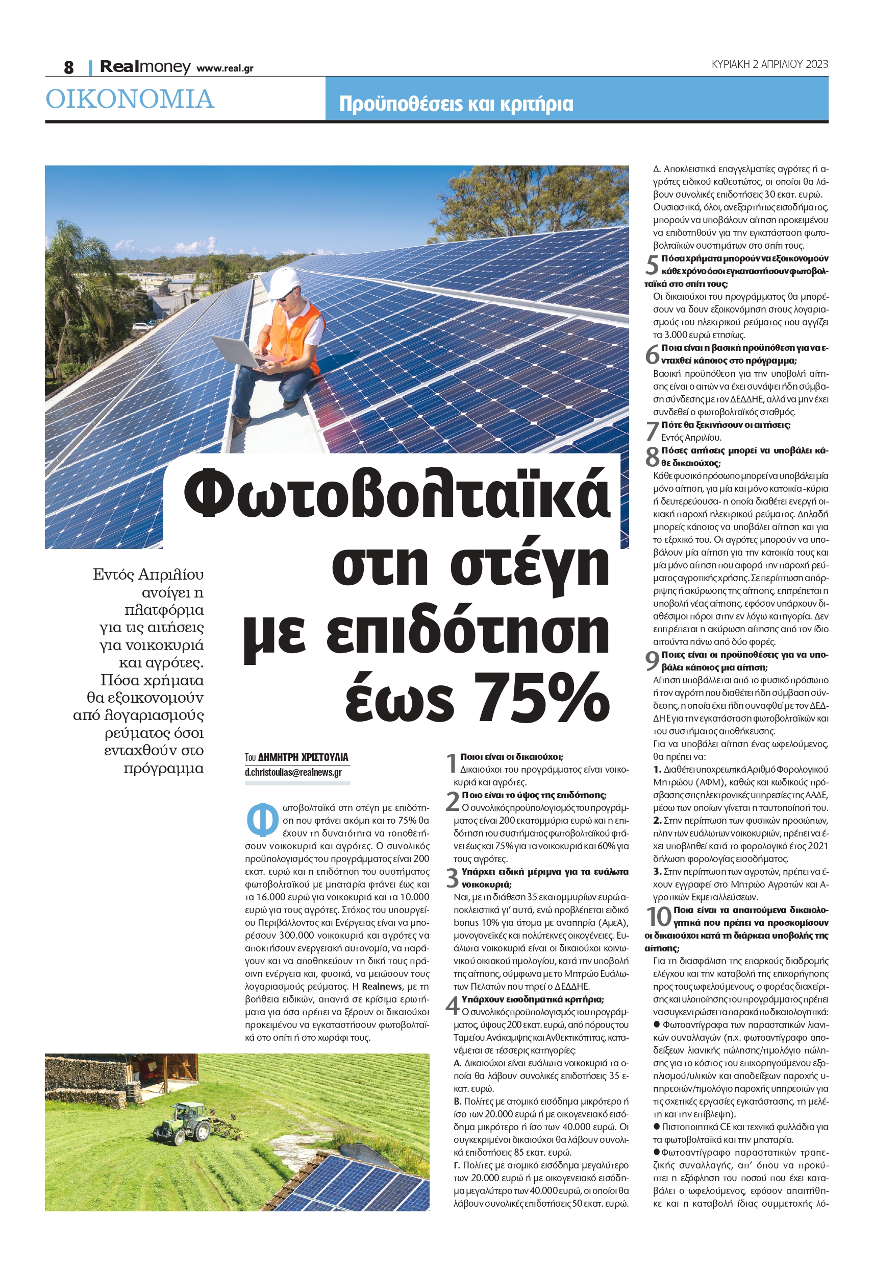 Φωτοβολταϊκά στη στέγη με επιδότηση που φτάνει ακόμη και το 75% θα έχουν τη δυνατότητα να τοποθετήσουν νοικοκυριά και αγρότες. Ο συνολικός προϋπολογισμός του προγράμματος είναι 200 εκατ. ευρώ και η επιδότηση του συστήματος φωτοβολταϊκού με μπαταρία φτάνει έως και τα 16.000 ευρώ για νοικοκυριά και τα 10.000 ευρώ για τους αγρότες.