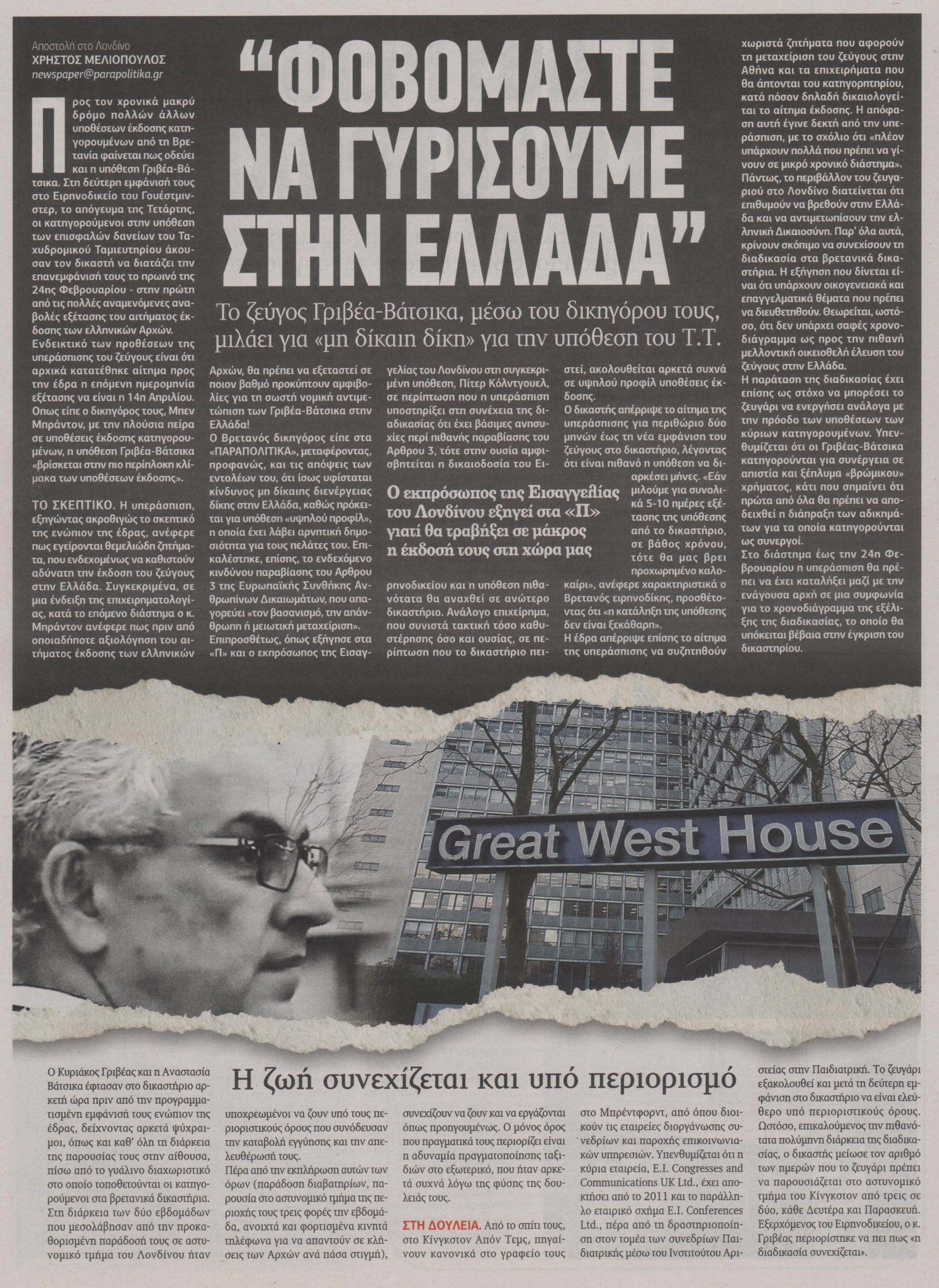 Ο δικηγόρος του ζεύγους Μπεν Μπράντον εξήγησε ενώπιον της έδρας στο δικαστήριο του Γουεστμίνστερ ότι εγείρονται θεμελιώδη ζητήματα, που ενδεχομένως να καθιστούν αδύνατη την έκδοση του ζεύγους στην Ελλάδα. Ζήτησε να εξεταστεί σε ποιον βαθμό προκύπτουν αμφιβολίες για τη σωστή νομική αντιμετώπιση των Γριβέα-Βάτσικα στην Ελλάδα!