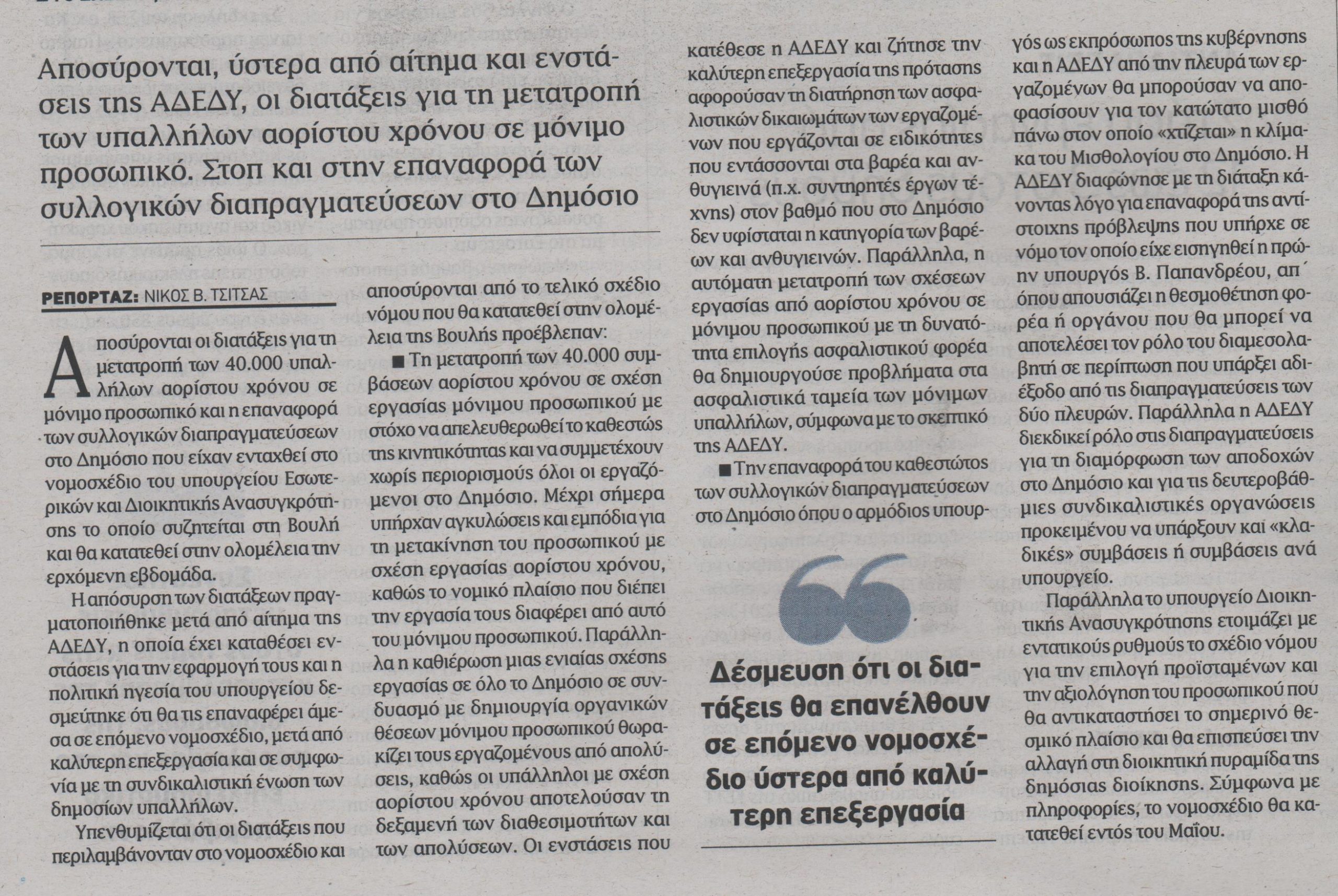 Αποσύρονται οι διατάξεις για τη μετατροπή των 40.000 υπαλλήλων αορίστου χρόνου σε μόνιμο προσωπικό και η επαναφορά των συλλογικών διαπραγματεύσεων στο Δημόσιο που είχαν ενταχθεί στο νομοσχέδιο του υπουργείου Εσωτερικών και Διοικητικής Ανασυγκρότησης το οποίο συζητείται στη Βουλή και θα κατατεθεί στην ολομέλεια την ερχόμενη εβδομάδα.