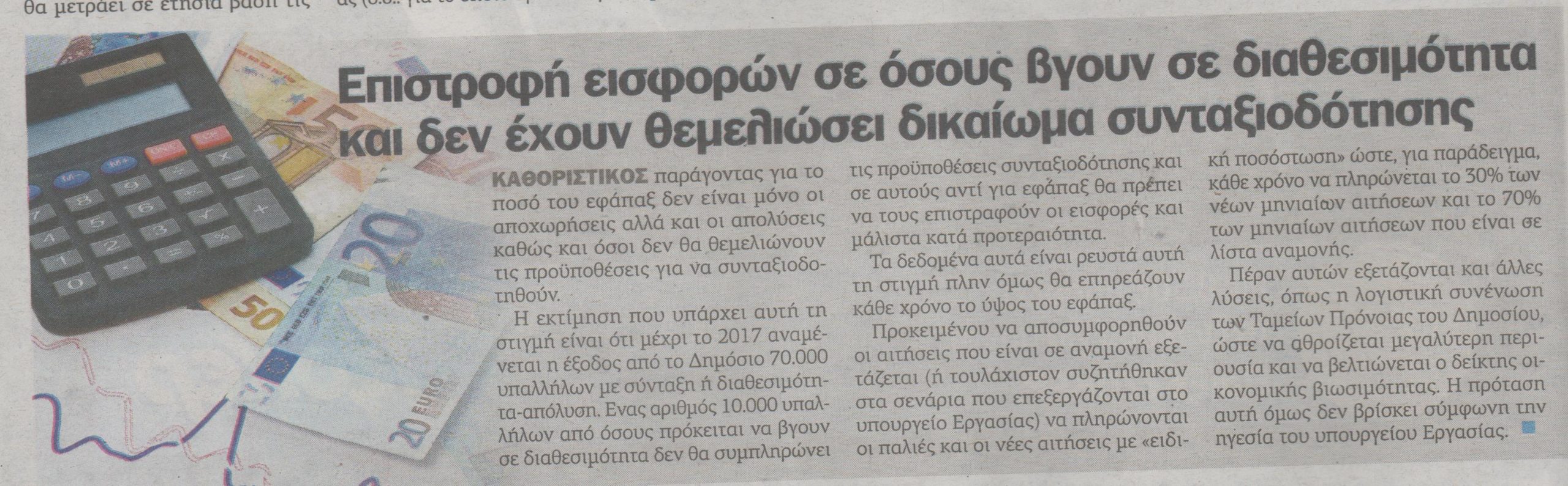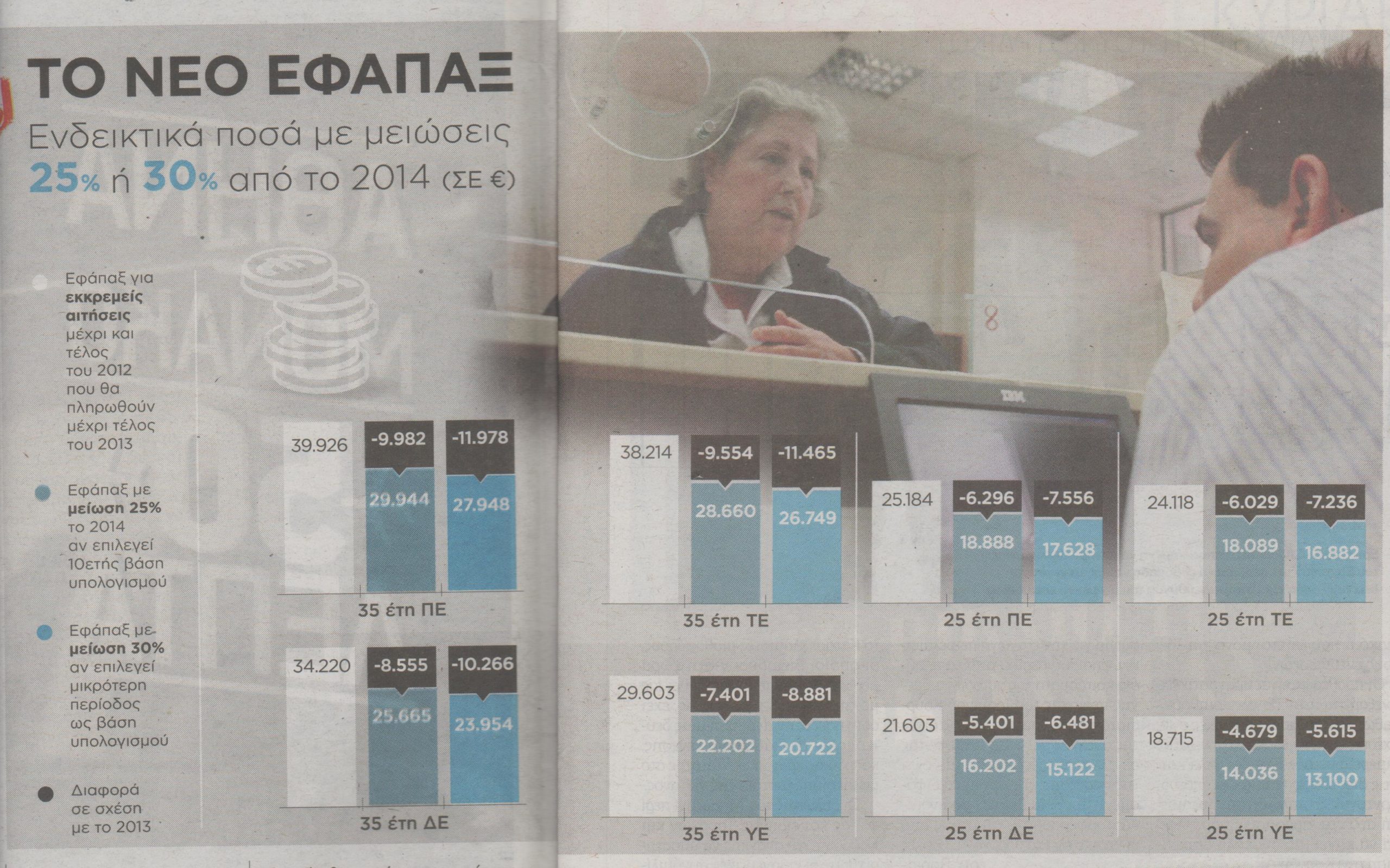 Με το σχέδιο του υπουργείου και το «μοίρασμα» των υποχρεώσεων σε βάθος 10ετίας, οι μειώσεις κόβονται στη μέση και, όπως τουλάχιστον δείχνουν τα παραδείγματα της αναλογιστικής αρχής για την εφαρμογή της νέας τεχνικής βάσης υπολογισμού του εφάπαξ, οι περικοπές «φρενάρουν» στο -25% για τα έτη από το 2014 έως το 2016 ενώ μετά το 2017 που μειώνονται οι αποχωρήσεις των δημοσίων υπαλλήλων, η κατάσταση εξομαλύνεται και οι μειώσεις μπορεί να είναι μικρότερες.