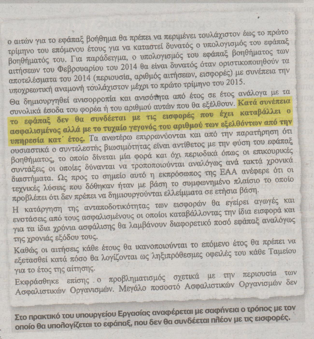 Το εφάπαξ θα υπολογίζεται από το 2014 ως εξής: Έσοδα από εισφορές συν περιουσία μείον κόστος αποχωρήσεων και σε κάθε περίπτωση αν το κόστος αποχωρήσεων είναι μεγαλύτερο από τα έσοδα θα γίνεται αυτόματη μείωση ώστε να μην υπάρχουν ελλείμματα στα Ταμεία Πρόνοιας.