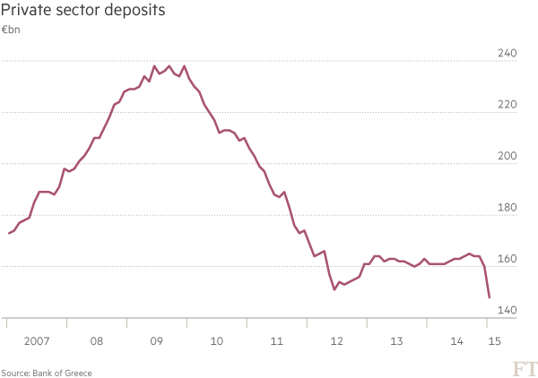 Οι καταθέσεις του ιδιωτικού τομέα μειώθηκαν από 240 δισ. ευρώ στα 150 δισ. ευρώ μεταξύ 2009 και 2012. Κινητήριος δύναμη ήταν ο φόβος για ενδεχόμενη αποχώρηση της Αθήνας από το ευρώ, που θα επέβαλε περιορισμούς στις κινήσεις κεφαλαίων και επιβεβλημένη μετατροπή όλων των καταθέσεων στις νέες -βαριά υποτιμημένες- δραχμές.
