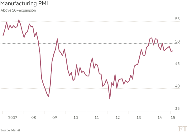 Ο δείκτης δραστηριοτήτων για τον βιομηχανικό κλάδο υποχώρησε στο 48,3 τον Ιανουάριο και διαμορφώθηκε στο 48,4 το Φεβρουάριο. Και οι δύο δείκτες βρίσκονται κάτω από το 50, που διαχωρίζει την ανάπτυξη από τη συρρίκνωση (ύφεση).