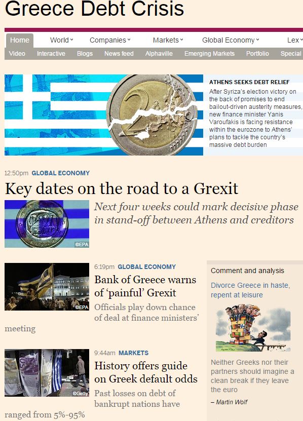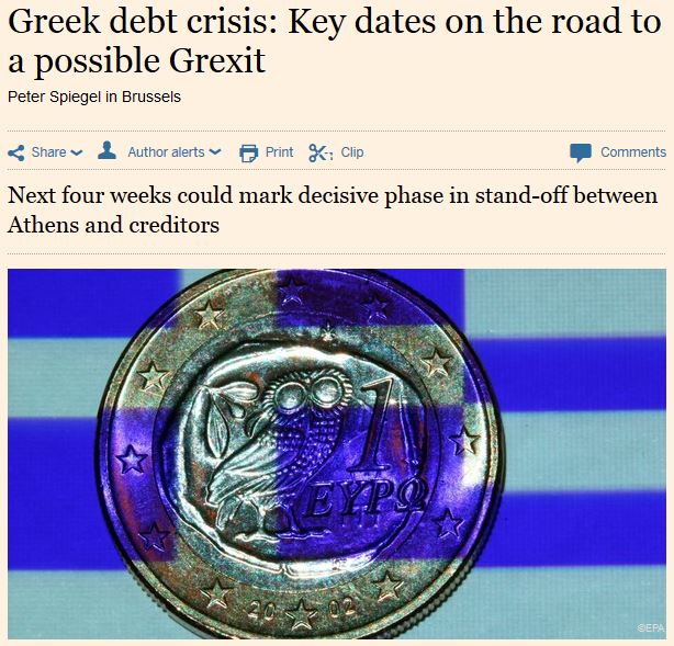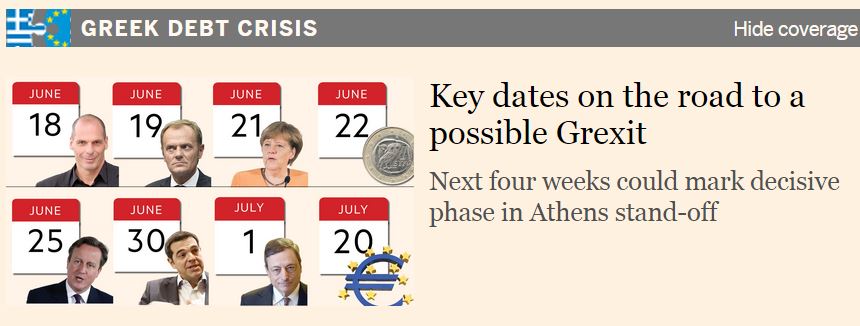 Τις ημερομηνίες-κλειδιά στο δρόμο για πιθανό Grexit, εντός των επόμενων τεσσάρων εβδομάδων, παρουσιάζει σε άρθρο του στους Financial Times, ο Πίτερ Σπίγκελ. Όπως αναφέρει η πεντάμηνη έντονη διαπραγμάτευση μεταξύ Ελλάδας και πιστωτών έχει, πλέον, εισέλθει στην πιο κρίσιμη φάση της.