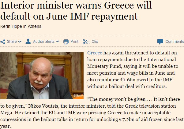 Με αφορμή δηλώσεις υπουργών και στελεχών του ΣΥΡΙΖΑ οι Financial Times αναδεικνύουν ξανά το ζήτημα της μη πληρωμής της δόσης των 300 εκατ. ευρώ προς το Διεθνές Νομισματικό Ταμείο στις 5 Ιουνίου από την Ελλάδα βάσει των δηλώσεων στην αντιπαράθεση στην κεντρική επιτροπή του ΣΥΡΙΖΑ.