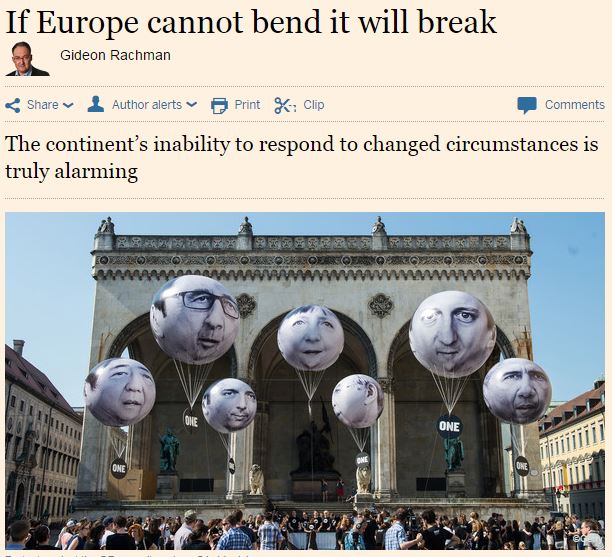 «Αυτή η αδυναμία ευελιξίας στις αλλαγές είναι επικίνδυνη. Μία Ευρώπη που δεν μπορεί να είναι ευέλικτη, το πιθανότερο είναι να διασπασθεί», σημειώνει ο Ράχμαν.
