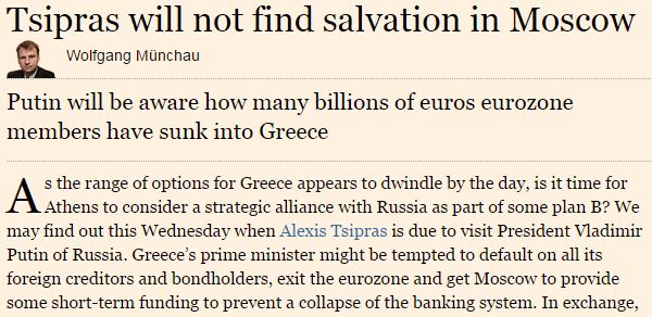 Η Μόσχα δεν μπορεί να σώσει την Αθήνα για τρεις βασικούς λόγους, γράφει ο Β. Μινχάου, στην εφημερίδα Financial Times, με τίτλο «Ο Τσίπρας δεν θα θα βρει τη σωτηρία στη Μόσχα», ενόψει της συνάντησης Τσίπρα – Πούτιν 8 και 9 Απριλίου.