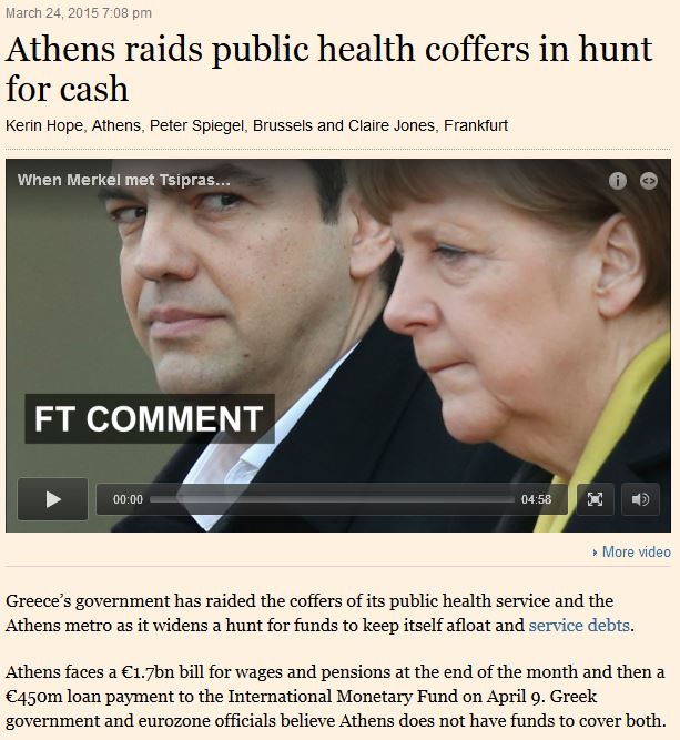 Στην προσπάθειά της να βρει χρήματα για να πληρώσει μισθούς και συντάξεις και τα χρέη που λήγουν, η ελληνική κυβέρνηση “βάζει χέρι” στα διαθέσιμα που έχουν στις τράπεζες δημόσιοι οργανισμοί – μεταξύ των οποίων η «Αττικό Μετρό»- και στο αποθεματικό του εθνικό σύστημα υγείας για την πληρωμή υγειονομικού προσωπικού, αναφέρει δημοσίευμα της εφημερίδας Financial Times.