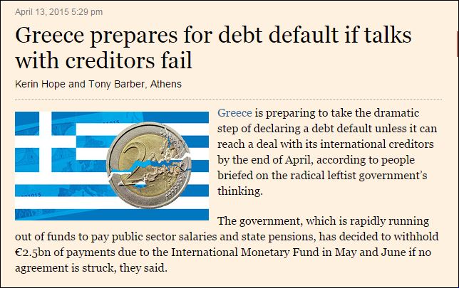 Η Ελλάδα προετοιμάζεται να κηρύξει χρεοκοπία, εκτός και αν καταφέρει να φτάσει σε μια συμφωνία με τους πιστωτές της έως τα τέλη Απριλίου, σύμφωνα με τους Financial Times, που επικαλούνται ανθρώπους που ενημερώθηκαν – όπως αναφέρεται στο δημοσίευμα – για τις σκέψεις της κυβέρνησης.