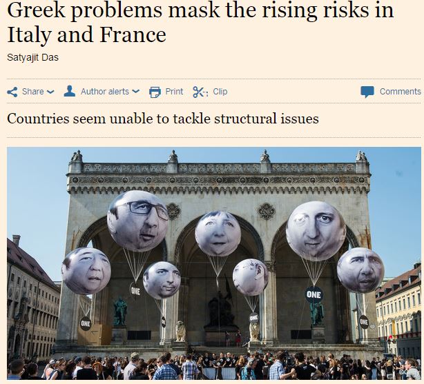 Τα υπέρογκα προβλήματα χρέους, η αναιμική ανάπτυξη και οι αδυναμίες στα δημοσιονομικά και εργασιακά ζητήματα ταλανίζουν τον πυρήνα του ευρώ, τη Γαλλία και την Ιταλία, σημειώνει το άρθρο του Satyajit Das, πρώην τραπεζίτης και συγγραφέας του «Extreme Money and Traders Guns & Money».