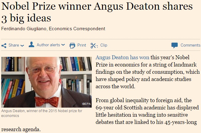 Λίγες ώρες μετά την είδηση για το βραβείο που έλαβε, ο κ. Deaton μοιράστηκε με τους Financial Times τις ενίοτε αμφιλεγόμενες ιδέες του σε τρεις από τους πιο σημαντικούς τομείς πάνω στους οποίος έχει εργαστεί.