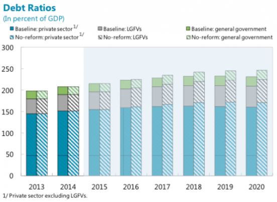 Οι τονωτικές κρατικές ενέσεις στην κινέζικη οικονομία τα τελευταία χρόνια έχουν οδηγήσει σε τετραπλασιασμό του χρέους της Κίνας από 7 τρισ. δολ. το 2007 σε 28 τρισ. δολ., που ισοδυναμεί με 282% ΑΕΠ.