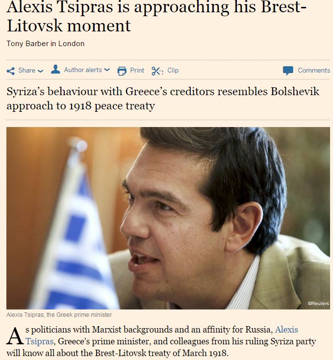 Με τη συνθήκη Μπρεστ-Λιτόφσκ που έκλεισαν οι Μπολσεβίκοι για να σταματήσει οριστικά ο πόλεμος του Τσάρου με τη Γερμανία στην επαναστατημένη Ρωσία το Μάρτιο του 1918 παραλληλίζουν οι Financial Times τις διαπραγματεύσεις για συμφωνία Ελλάδας – δανειστών, με μπόλικη ειρωνική διάθεση φυσικά απέναντι στην κυβέρνηση Τσίπρα.