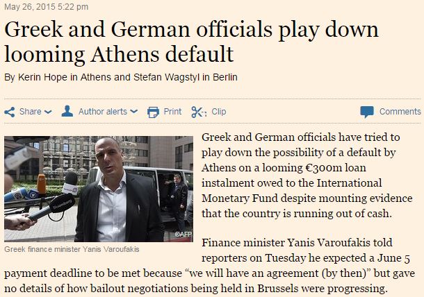 Στην Ελλάδα το ίδιο, αξιωματούχοι προσπαθούν να υποβαθμίσουν την πιθανότητα η Αθήνα να προχωρήσει σε στάση πληρωμών αρχίζοντας από τη δόση των 300 εκατ. ευρώ προς το Διεθνές Νομισματικό Ταμείο στις 5 Ιουνίου, παρά τις αυξανόμενες ενδείξεις ότι η χώρα στερεύει από ρευστό, αναφέρει το δημοσίευμα.