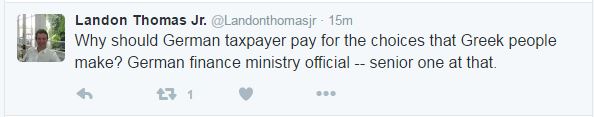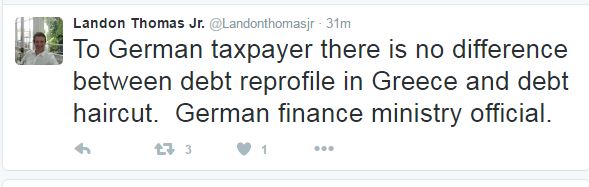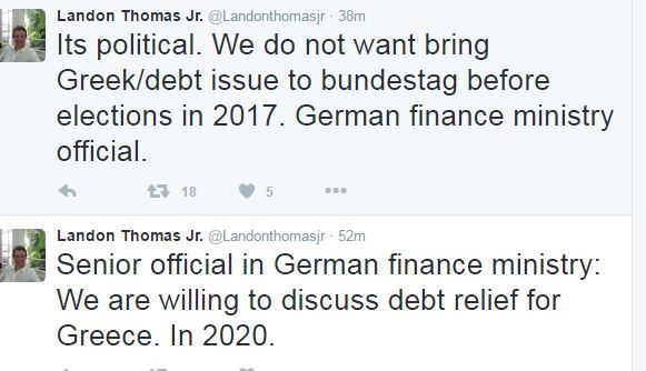 Όπως έγραψε ο δημοσιογράφος στο twitter, ο αξιωματούχος του γερμανικού υπουργείου Οικονομικών του είπε: «Είμαστε πρόθυμοι να συζητήσουμε το θέμα της ελάφρυνσης του ελληνικού χρέους. Το 2020».