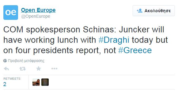 Γεύμα εργασίας θα έχουν ο πρόεδρος της Κομισιόν Ζαν Κλοντ Γιούνκερ με τον πρόεδρο της ΕΚΤ Μάριο Ντράγκι.