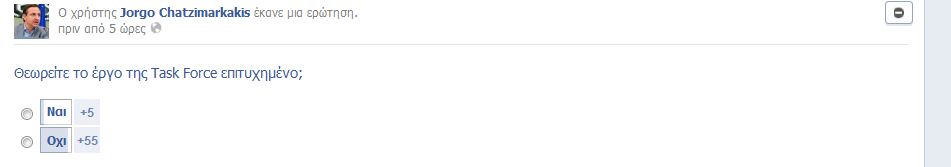Ο κ. Χατζημαρκάκης προχωρά ένα βήμα παρακάτω και διοργανώνει μία πρωτότυπη δημοσκόπηση μέσω της σελίδας του ρωτώντας τον κόσμο αν θεωρεί επιτυχημένο το έργο της Task Force.
