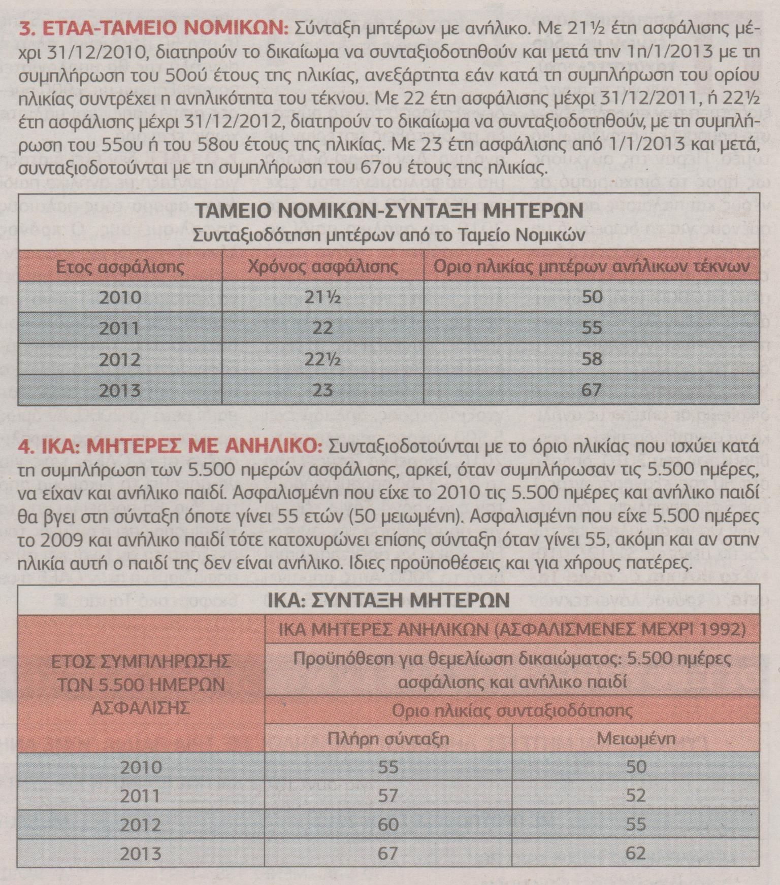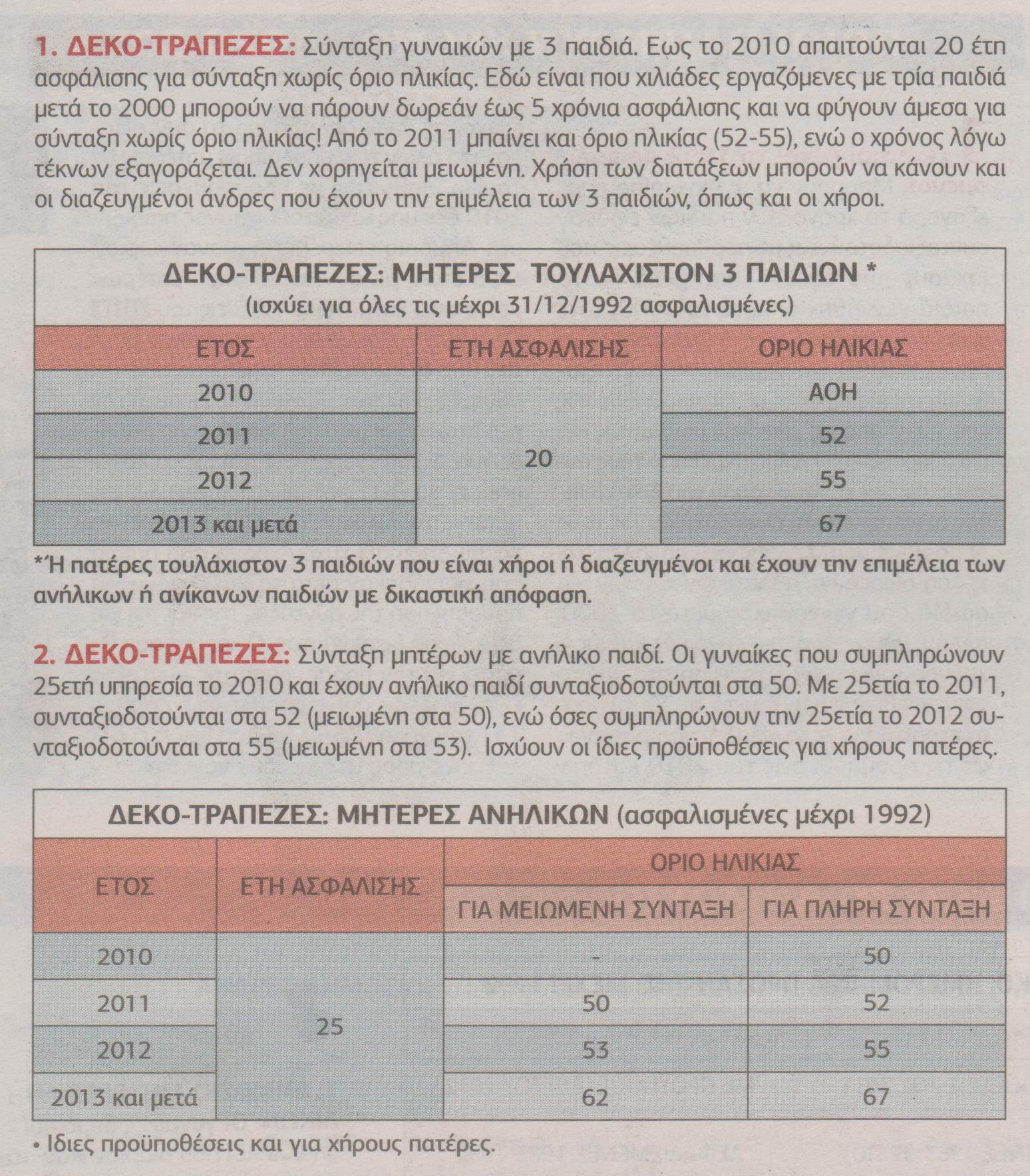 Γονείς που είναι ασφαλισμένοι σε ταμεία μισθωτών (Δημόσιο, ΙΚΑ, ΔΕΚΟ, τραπεζών) ή και ελευθέρων επαγγελματιών και έχουν παιδιά είτε ενήλικα, είτε ανήλικα, μπορούν ακόμη και σήμερα που τα επίσημα όρια ηλικίας για σύνταξη είναι στα 62 και στα 67 να εκμεταλλευτούν τις μεταβατικές διατάξεις του ασφαλιστικού και να κατοχυρώσουν σύνταξη από τα 50 ή ακόμα και χωρίς όριο ηλικίας, λόγω τέκνων!