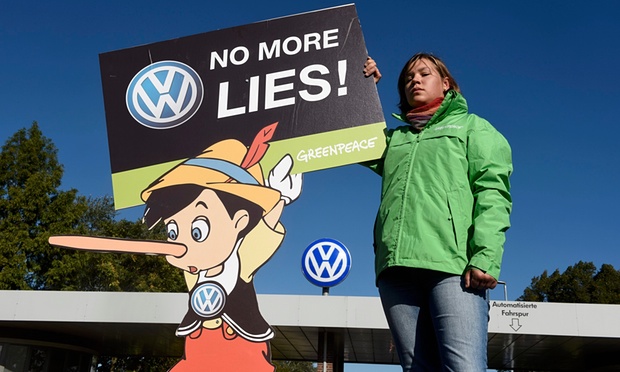 Μια ομάδα ακτιβιστών της Greenpeace διαδήλωσε για το σκάνδαλο της χειραγώγησης ρύπων έξω από τα κεντρικά γραφεία της Volkswagen στο Βόλφσμπουργκ στην καρδιά της Γερμανίας.