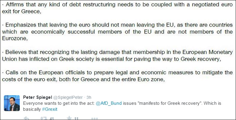 Να λάβει μέτρα για να περιοριστούν οι επιπτώσεις από ένα Grexit καλεί την Ευρώπη, το ευρωσκεπτικιστικό κόμμα «Εναλλακτική για τη Γερμανία».