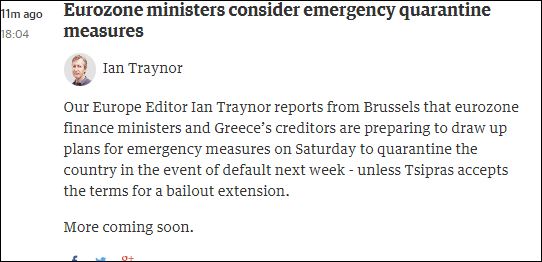 Ο ανταποκριτής του Guardian στις Βρυξέλλες Ian Traynor μεταδίδει ότι οι υπουργοί Οικονομικών της Ευρωζώνης και οι πιστωτές της Ελλάδας ετοιμάζονται να καταρτίσουν το Σάββατο σχέδιο για μέτρα έκτακτης ανάγκης για να θέσουν την χώρα σε καραντίνα σε περίπτωση χρεοκοπίας την επόμενη εβδομάδα – εκτός και αν ο Αλέξης Τσίπρας αποδεχθεί τους όρους για την παράταση του προγράμματος.
