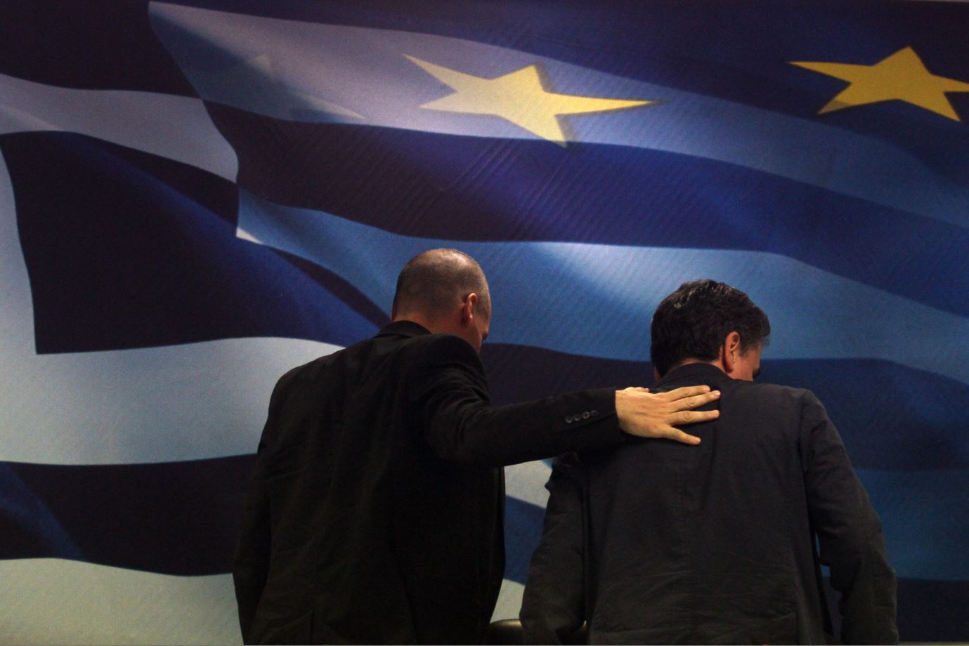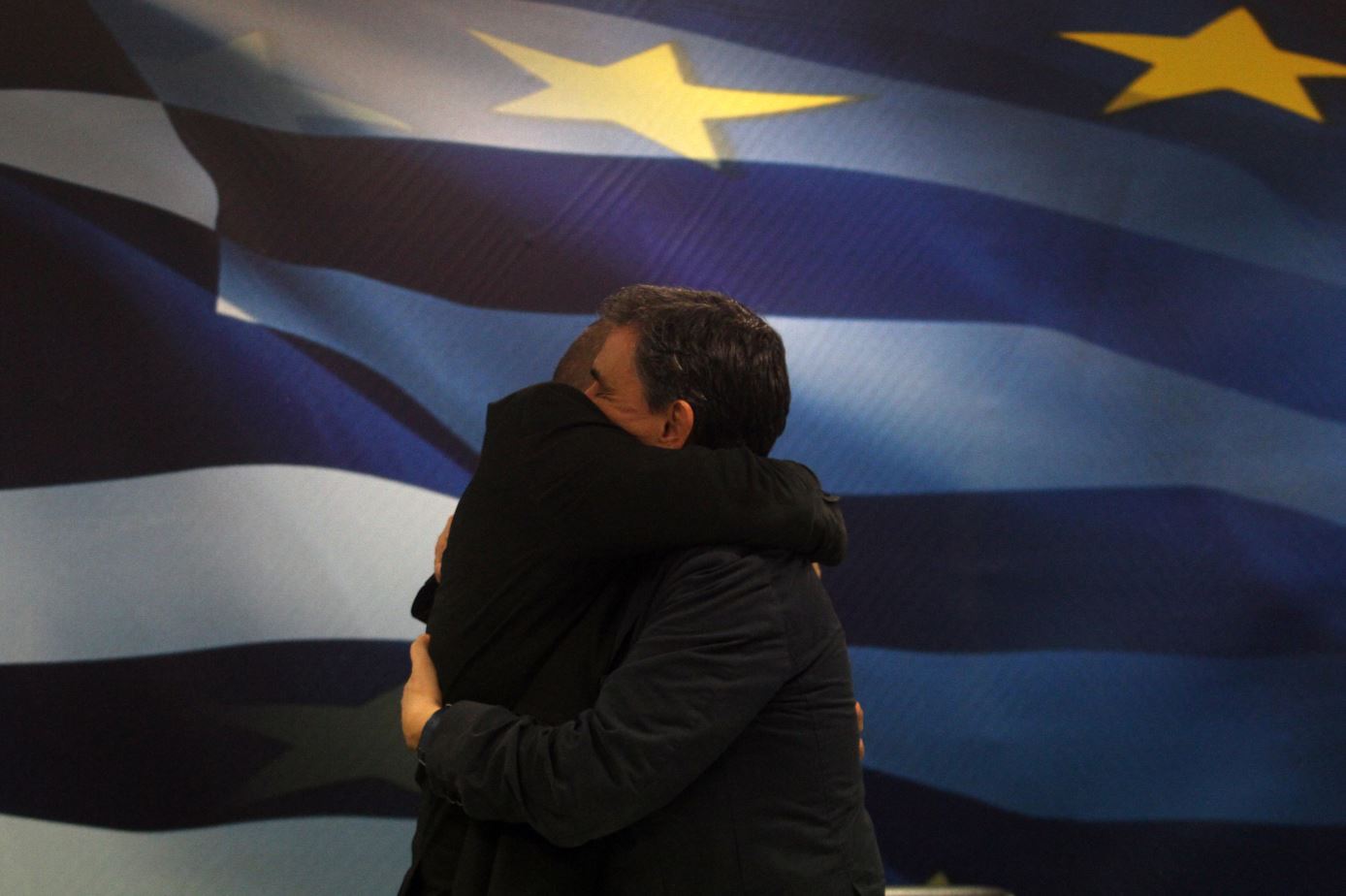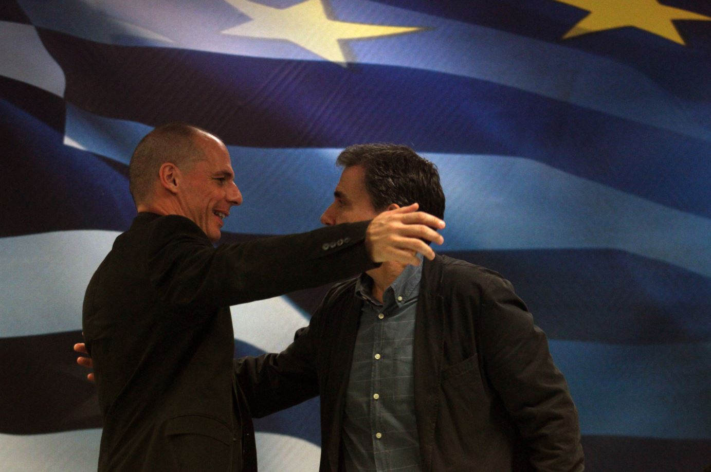 Η τελετή παράδοσης – παραλαβής στο υπουργείο Οικονομικών ολοκληρώθηκε με μια αγκαλιά ανάμεσα στον απερχόμενο υπουργό Γιάννη Βαρουφάκη και τον νέο τσάρο της ελληνικής οικονομίας, Ευκλείδη Τσακαλώτο.